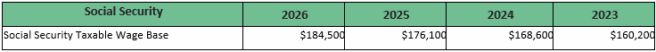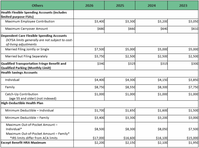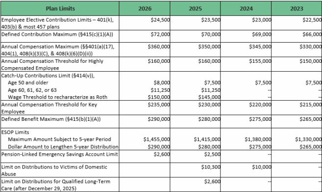The table below provides the IRS and SSA limits for 2026 applicable to the various employer-sponsored retirement, welfare, and fringe benefit plans or programs listed below.  The amounts for 2026 in the table below are based on information contained in IRS Notice 2025-67; IRS Rev. Proc. 2025-19; IRS Rev. Proc. 2025-32; One Big Beautiful Bill Act; and SSA Press Release (10.24.2025).